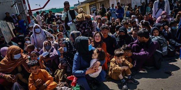 Crédit photo : Le 25 août, des femmes et des enfants afghans attendent de pouvoir fuir le pays à l’aéroport de Kaboul © MARCUS YAM/LA TIMES/SHUTTERSTOCK/Sipa