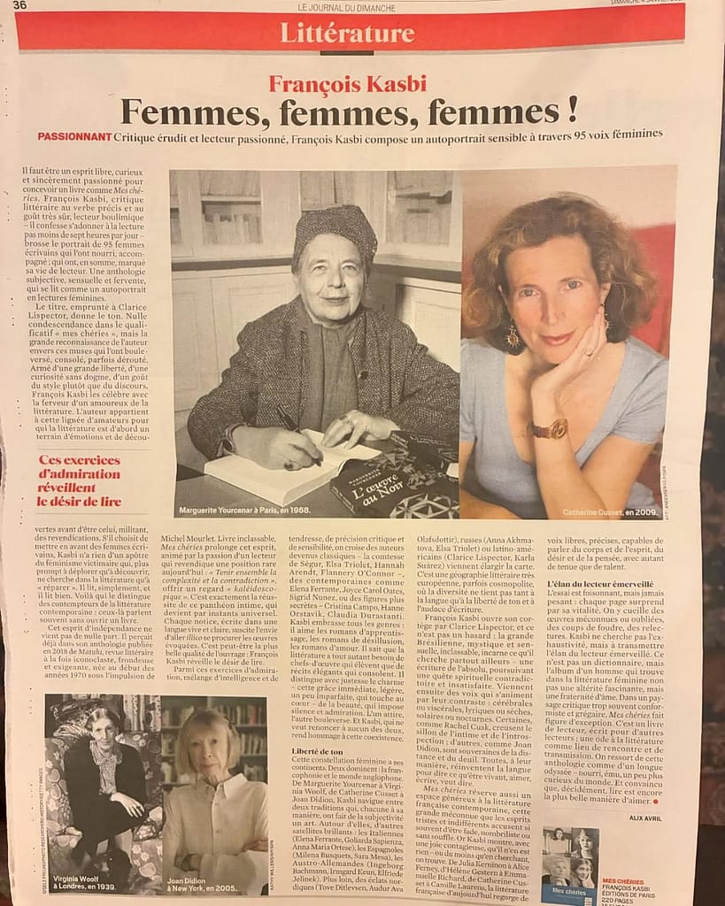 Dans Mes chéries, François Kasbi rend hommage à une centaine de femmes écrivains qui ont profondément marqué sa vie de lecteur, mêlant portraits, émotions et souvenirs de lecture. Parmi ces voix littéraires, Catherine Cusset occupe une place de choix en tant qu’auteure reconnue pour son écriture personnelle et puissante, incarnant l’intime et la modernité dans le paysage littéraire contemporain.